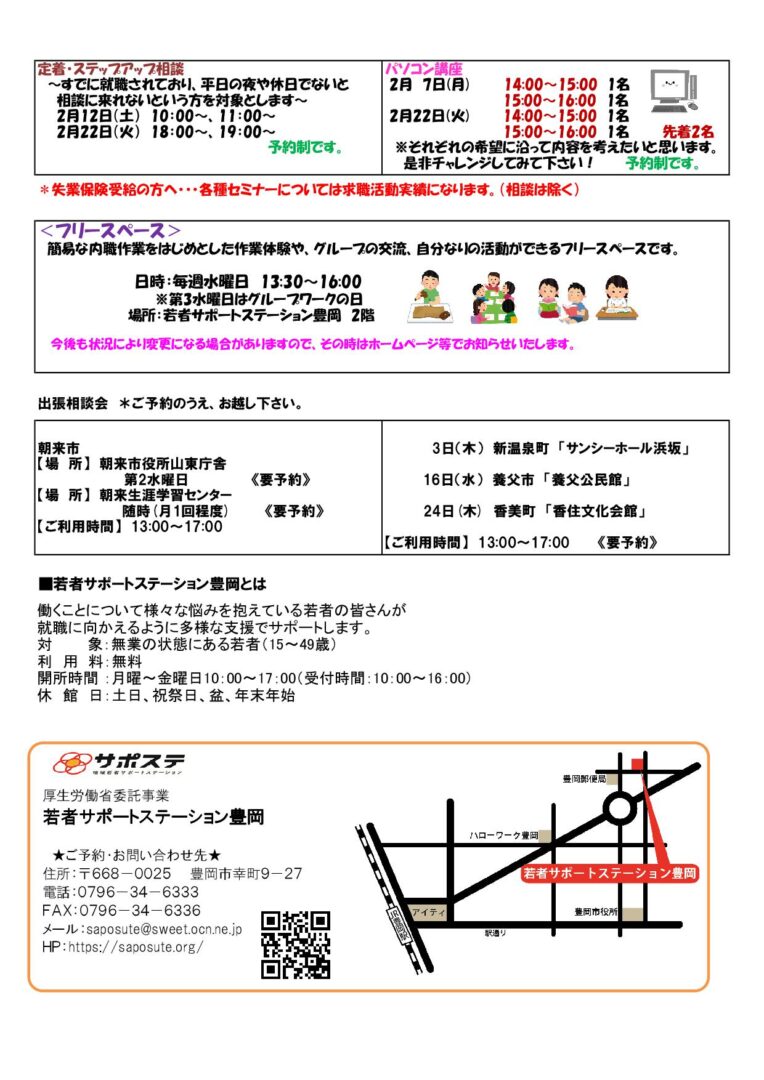 2022年1月28日 / 最終更新日時 : 2023年9月28日 saposute スケジュール 2022年2月の予定 サポステ豊岡2022年2月の予定を掲載します。 緊急事態宣言等の状況により、プログラムの時間変更や中止の可能性がありますのでご承知おきください。 その際はホームページにてお知らせいたします。 令和4年1月28日 サポステ豊岡